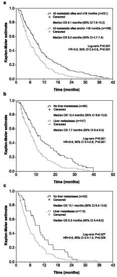 Kaplan–Meier plots for overall survival in the exploratory analysis of prognostic subsets. They included the comparison of patients with ≤2 metastatic sites and ≥18 months from metastasis diagnosis versus those with ≥3 metastatic sites and/or <18 months (a), patients with ≤2 metastatic sites, ≥18 months from metastasis diagnosis and absence of liver metastasis versus those with ≤2 metastatic sites, ≥18 months from metastasis diagnosis and liver metastasis (b), and patients with ≥3 metastatic sites and/or <18 months from metastasis diagnosis and absence of liver metastasis versus those with ≥3 metastatic sites and/or <18 months from metastasis diagnosis and liver metastasis (c). CI: confidence interval, HR: hazard ratio, OS: overall survival.