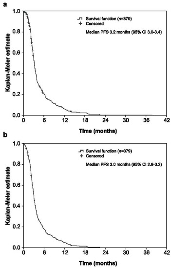 The median PFS measured until radiologic disease progression or death was 3.2 months (95% CI 3.0–3.4; Figure 3a), with PFS rates at 2, 4, 6, 8, 10, and 12 months of 82.9% (95% CI 79.0–86.8%), 34.1% (95% CI 29.1–39.2%), 21.3% (95% CI 16.9–25.6%), 14.5% (95% CI 10.7–18.3%), 9.8% (95% CI 6.6–13.1%), and 6.4% (95% CI 3.7–9.0%), respectively. When its definition included clinical disease progression, the median PFS was 3.0 months (95% CI 2.8–3.2; Figure 3b) and PFS rates at 2, 4, 6, 8, 10, and 12 months were 77.2% (95% CI 72.9–81.4%), 30.7% (95% CI 26.1–35.4%), 18.4% (95% CI 14.5–22.4%), 12.6% (95% CI 9.2–15.9%), 8.3% (95% CI 5.5–11.1%), and 5.3% (95% CI 3.1–7.6%), respectively.