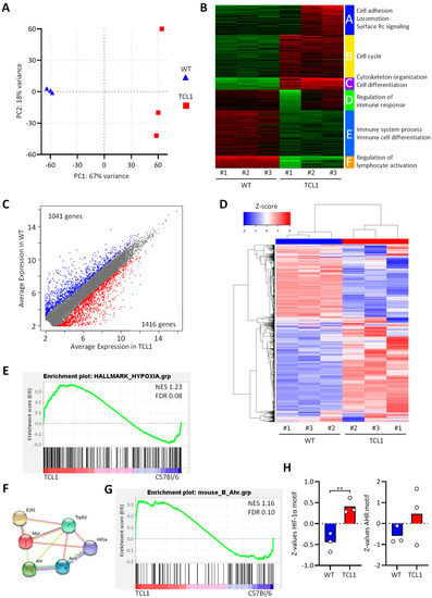 RNA sequencing of B cells from C57BL/6 and Eµ-TCL1 mice. Splenic B cells were FACS-sorted from three mice of each genotype, and mRNA was sequenced. (A) Principal component analysis of individual animals. (B) K-means clustering and Gene Ontology enrichment analysis. (C) Scatterplot depicting the expression of genes in the groups. (D) Unsupervised hierarchical clustering showing 1416 genes upregulated and 1041 genes downregulated in TCL1. (E,G) Gene Set Enrichment Analysis showing the enrichment of hypoxia (E) and AHR (G) signatures in Eµ-TCL1 versus C57BL/6 mice. (F) Protein–protein interactions network (STRING) for transcription factors involved in enriched hallmark pathways (GSEA). (H) Transcription factor activity (Z-values, ISMARA) for HIF-1α and AHR motifs in WT and TCL1 B cells.