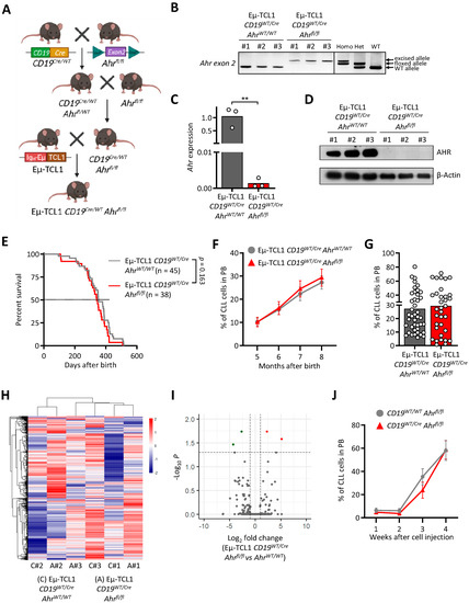 Furthermore, in order to investigate whether AHR knock-out in normal B cells could impact CLL development, we injected Eµ-TCL1 CLL cells into mice lacking AHR in normal B cells (CD19Cre/WT Ahrfl/fl). As observed for the transgenic model, we could not detect any difference in CLL development for the adoptive transfer in either CD19Cre/WT Ahrfl/fl or CD19WT/WT Ahrfl/fl recipient mice (Figure 3J).