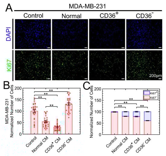 The 3D growth of MDA-MB-231 is suppressed as a result of exposure to the CM from CD36+ FBs. (A) The number of cells (DAPI) and their proliferation status (Ki67) is monitored and visualized by fluorescent microscopy under control and exposure to the CM from normal, CD36+, or CD36− FBs. (B) The number of cells was quantified for each condition based on the nuclear counterstain. (C) Frequency of low and high expressing Ki67 cells was quantified for each condition. For (B,C), quantitative data were normalized to control (untreated cells). ** p < 0.001.