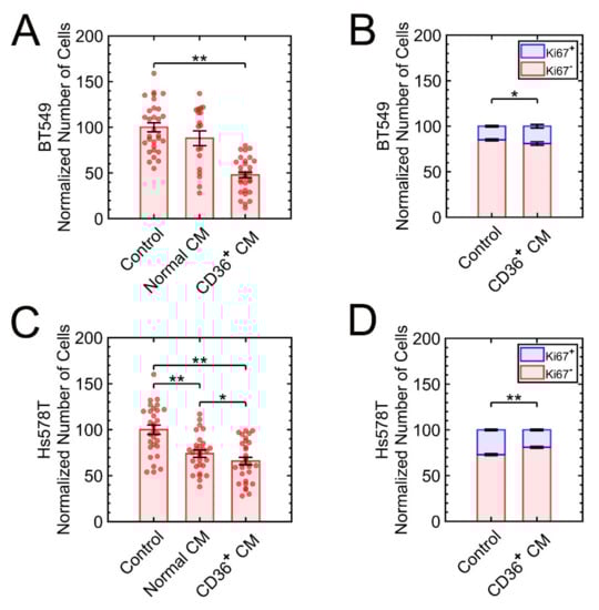 The 3D growths of BT-549 and Hs578T are suppressed as a result of exposure to the CM from CD36+ FBs. (A,B) The numbers of cells for BT549 and the frequencies of high versus low expressing Ki67 cells are quantified. (C,D) The numbers of cells for Hs578T and the frequencies of high versus low expressing Ki67 cells are quantified. Quantitative data were normalized to control (untreated cells). * p < 0.05, ** p < 0.001.
