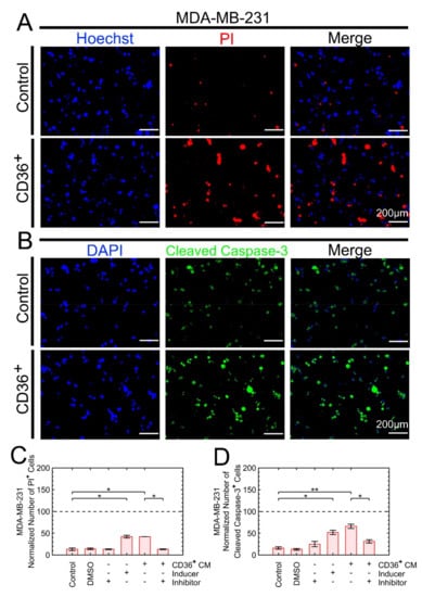 Exposure to the CM of CD36+ FBs increases the frequency of apoptotic cells. (A,C) PI staining indicated a higher frequency of cell death with exposure to the CM of CD36+ FBs. (B) Cleaved caspase-3 staining was monitored with fluorescent microscopy. (C,D) Inducer and inhibitor of apoptosis pathway enabled the selection of a threshold for quantitative analysis. In both cases, the frequencies of apoptotic cells, as the result of exposure to the CM of CD36+ FB, were the same as the treatment with apoptosis inducer. * p < 0.05, ** p < 0.001.