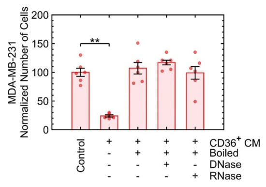 A heat inactivation assay was used to determine whether nucleic acid sequences or protein complexes in the CM of CD36+ FBs were responsible for growth suppression. The heat inactivation assay denatures large proteins, degrades RNA, and breaks up lipid membranes of the vesicles to release their contents. Subsequently, RNase or DNase enzymes were added to the heated CM to remove any remaining RNA or DNA compounds. The number of MDA-MB-231 cells, after seven days, was used as an endpoint for each treatment of the CM of CD36+ FBs. Because the heat inactivation assay and the addition of DNase or RNase interfered with the growth suppression (Figure 4), proteins are likely candidates.