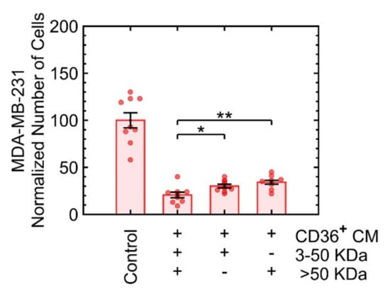 A follow-up experiment was performed to fractionate protein complexes based on their size and quantify the effect of each fraction on the growth of MDA-MB-231. Fractionation included ranges of 3 to 50 kDa and larger than 50 kDa. Both fractions induced growth suppression independently (Figure 5). The selection of the filter size was a compromise between the known range of cytokines [] and the commercial availability of the filters.
