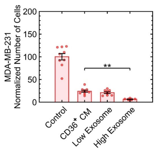 In physiological conditions, signaling proteins can be soluble or encapsulated in exosomes and microvesicles. Since the biogenesis of the exosomes can be manipulated [], we investigated their impact on growth suppression. The culture condition of the CD36+ FB was supplemented with 1 μM tipifarnib or 10 μM sitafloxacin for low and high exosome production, respectively []. For each condition of low or high exosome biogenesis, the CM was collected, added to the culture condition of MDA-MB-231, incubated, and samples were then fixed, stained, and imaged with fluorescent microscopy to count the number of cells. The results indicated that only at high biogenesis of exosomes, a slight increase in growth suppression was observed (Figure 6). In other words, protein ligands or microvesicles appear to be the major factors in growth suppression.