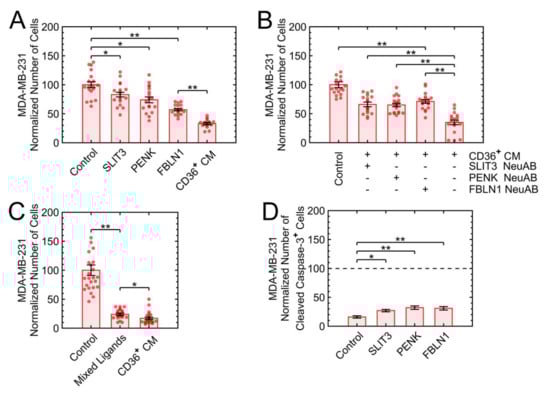 The mixture of three ligands added to the normal culture induces a similar level of growth suppression as the CM of CD36+ FBs. (A) The addition of each recombinant protein to the MDA-MB-231 medium induced partial growth suppression. (B) The addition of each neutralizing antibody to the CM of CD36+ FBs interfered partially with the growth suppression. (C) Mixed recombinant proteins of SLIT3, PENK, and FBLN1 induced an additive growth suppression that was similar to the CM of CD36+ FBs. (D) Protein ligands induced apoptosis via the caspase-3 pathway after one day of treatment. * p < 0.05, ** p < 0.001.
