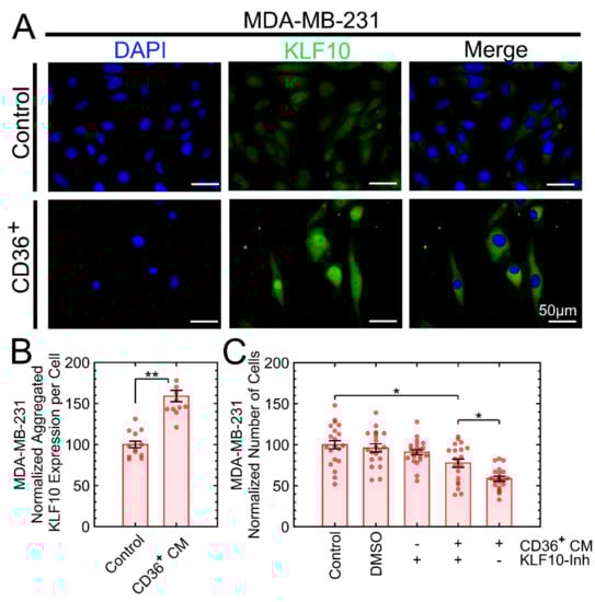 Overexpression of the KLF10 transcription factor is one of the mechanisms for growth suppression in MDA-MB-231 as a result of exposure to the CM of CD36+ FBs. (A) DAPI and KLF10 staining for control and treatment were monitored with fluorescent microscopy. (B) Quantitative analysis indicated overexpression of KLF10 with the treatment. (C) A control experiment to validate reduced growth suppression by adding the KLF10-inhibitor to the CM of CD36+ FBs. * p < 0.05, ** p < 0.001.