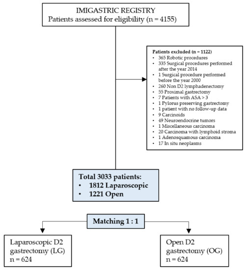 As indicated in Figure 1, a total of 4155 patients affected by gastric adenocarcinoma and registered in the IMIGASTRIC registry underwent total or distal gastrectomy and were therefore considered for inclusion in the study. After the application of the predefined inclusion and exclusion criteria, a total of 1122 patients were excluded (reasons for exclusion are indicated in Figure 1). Finally, a total of 3033 patients were included in the study, of whom 1812 underwent laparoscopic D2 gastric resection and 1221 underwent open D2 gastric resection for gastric adenocarcinoma. After 1:1 matching using the propensity score, two well-balanced groups, one composed of 624 patients undergoing laparoscopic D2 gastrectomy and one 624 patients undergoing open D2 gastrectomy, were selected for data analysis.