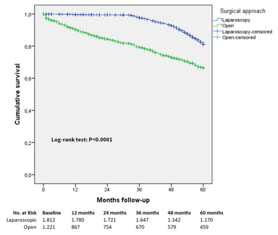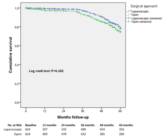 The follow-up duration in the entire study cohort was a median of 62 (IQR 38–78) months and a median of 60 (IQR 35–75) months in the matched study cohort. In the laparoscopic matched cohort, the median follow-up time was 63 (IQR 44–77) months, whereas in the open group the median follow-up time was 57 (IQR 24–72) months. The proportion of patients lost to follow-up was 9.2% and 14.1% in the entire and in the matched cohort, respectively. In the matched cohort, the median observation time in the population lost to follow-up was 21 (IQR 12–30) months in the laparoscopic group and 14 (IQR 2–57) months in the open group.