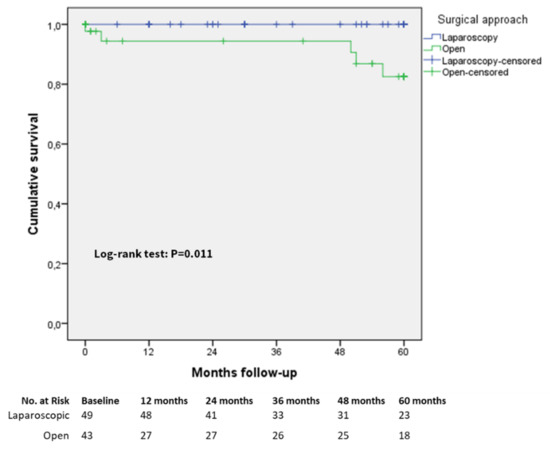 The five-year overall survival rates did not significantly differ in the matched group between the laparoscopic and open approaches, also considering separately each cancer stage as indicated in Table 4 and in Supplementary Figures S1–S9, except for the patients with cancer stage IB (Figure 4), for which five-year survival rates were 100% versus 82% in the laparoscopic and open groups, respectively (Log-rank (Mantel–Cox) test p = 0.011).