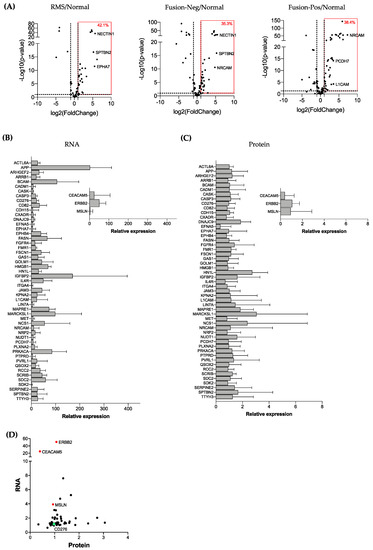 The abundance of the cell surface proteins was compared between the normal muscle, fusion-negative, and fusion-positive RMS cell lines. A high degree of correlation in the protein expression was observed for the two normal skeletal muscle cell lines (Pearson’s r = 0.7994 p < 0.0001). Among the fusion-negative and fusion-positive cell lines, positive associations were also observed, but the correlation coefficients varied from 0.2829 (fusion-positive) to 0.4736 (fusion-negative) (Figure S1E). Among the cell surface proteins commonly expressed in fusion-negative and fusion-positive cell lines, 57 proteins were upregulated by more than two-fold in RMS compared to normal muscle (Table S3). Similarly, 85 and 99 proteins were upregulated by more than two-fold in fusion-negative and fusion-positive RMS, respectively (Tables S4 and S5). To identify high-confidence cell surface targets in RMS, we interrogated a transcriptomic dataset (GSE108022) that consists of 66 fusion-negative RMS tumors, 35 fusion-positive RMS tumors, and 5 normal muscle tissues to analyze the gene expressions of our target candidates [5]. By using a two-fold increase and a p-value of 0.05 as the cut-off, we found that 42.1% (24 out of 57) of the targets overexpressed in all RMS cell lines at the protein level were also increased at the transcriptional level (Figure 2A and Table S6). When the samples were sub-grouped based on their fusion status, 35.3% (30 out of 85) and 38.4% (38 out of 99) of the targets were upregulated in RMS compared to normal muscle at the RNA level (Tables S7 and S8).