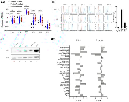 The Gene expression profiles of the B7 molecules showed B7-H3 as the most expressed B7 molecule in RMS, and the tumor expression was significantly higher in 100% of both fusion-negative RMS (9.45-fold) and fusion-positive RMS (7.03-fold) (Figure 3A). The B7-H6 gene expression was significantly increased in fusion-negative RMS. B7-H4 was upregulated in both RMS subtypes but at a greater extent in fusion-positive RMS (p = 0.06). Strikingly, both PD-L1 (B7-H1) and PD-L2 (B7-DC) were significantly downregulated in RMS compared to normal muscle. The cell surface protein expression of the B7 molecules was also assessed by flow cytometry in normal skeletal muscle cells, fusion-negative (RD), and fusion-positive RMS (RH30) (Figure 3B). Similar findings were obtained with B7-H3 being the most expressed B7 member, with a 3.42-fold increase in RMS cells. In contrast, PD-L1 and PD-L2 were downregulated in RMS, which corroborates with transcriptomic data. While B7-H4 and B7-H7 were not detected on the surfaces of normal and cancer cells, B7-H6 were weakly expressed in normal muscle and downregulated in RMS cell lines. In the proteomic data, the B7-H6 protein was expressed at low levels in three RMS cell lines (Table S1). A Western blot of the cell lines showed a similar increase of the total B7-H3 proteins in the RMS cell lines compared to the normal muscle (Figure 3C). We analyzed the tissue specificity score of B7-H3 in normal tissue as described previously [19]. The tissue specificity (TS) score defines the enrichment of B7H3 across normal tissues. A score superior of 2.5 means a protein is tissue-enriched, and a score superior of 4 defines a tissue-specific protein. An expression analysis in normal tissue showed a positive correlation between the RNA and protein expression of B7-H3 (Spearman correlation ρ = 0.84), and no tissue specificity was observed (Figure 3D).