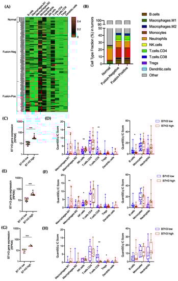 Relationship of B7-H3 expression and tumor-infiltrating immune cells in RMS. (A) Heatmap of immune cell abundance estimated by QuantiSeq analysis in normal muscle, fusion-negative and fusion-positive RMS. (B) Mean percentages of different immune cell subsets in normal muscle, fusion-negative and fusion-positive RMS. (C,E,G) B7-H3 RNA expression in quartile subgroups (25% highest, 25% lowest) in RMS tumors (C), FN-RMS (E) and FP-RMS (G) used for immune cell abundance analysis. (D,F,H) Bar graphs showing immune cell abundance between B7-H3-low and B7-H3-rich RMS tumors (D), FN-RMS only (F) and FP-RMS only (H). Significance is denoted by asterisks (*** p < 0.001; ** p < 0.01; * p < 0.05; Student’s t-test).