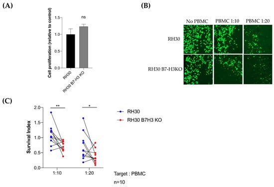 To confirm a potential association between B7-H3 and CD8-T cells, we performed a T-cell cytotoxicity assay by coculturing activated PBMC isolated from 10 healthy donors with RH30 wild-type or knockout cells for B7-H3 and monitored the tumor cell survival over time. No significant difference was observed in B7-H3 knockout RH30 cells compared to the wild type (Figure 6A). For eight out of 10 normal donors, the loss of B7-H3 was associated with an increase in tumor cell killing (Figure 6B,C). A decrease of 34% and 45% in tumor cell survival was observed with B7-H3 knockout tumor cells at a ratio of 1:10 and 1:20 RH30:PBMC, respectively.