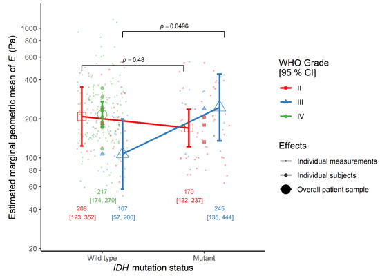 In contrast, the IDH mutation status by WHO grade interaction effect was significant, indicating that the effect of IDH mutation status on tissue elasticity was different between patients with a WHO grade II diffuse astrocytoma and a WHO grade III anaplastic astrocytoma. Therefore, the tissue elasticity was similar between patients with an IDH-mutant and an IDH-wildtype diffuse astrocytoma (ratio = 0.82, 95% CI 0.45–1.49, p = 0.480). This pattern was independent of tissue type (white matter: ratio = 0.61, 95% CI 0.27–1.37, p = 0.221; tumor: ratio = 1.09, 95% CI 0.49–2.47, p = 0.823). Tissues from IDH-mutant anaplastic astrocytoma cases were significantly stiffer than those from IDH-wildtype ones, when tissue type was ignored (ratio = 2.29, 95% CI 1.00–5.22, p = 0.0496) (Figure 1). A similar, although non-significant, proportional difference in elasticity was observed between IDH-mutant and IDH-wildtype anaplastic astrocytoma cases in both white matter (ratio = 2.27, 95% CI 0.69–7.50, p = 0.173) and tumor tissue (ratio = 2.30, 95% CI 0.70–7.60, p = 0.164).