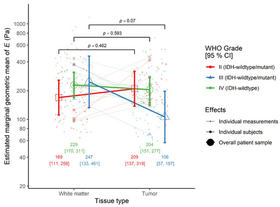 The effect of tissue type was similar between IDH-wildtype glioblastoma patients, where the elasticity was comparable between tumor and peritumoral white matter (ratio = 0.89, 95% CI 0.57–1.39, p = 0.593), and the average of IDH-wildtype WHO grade II and III astrocytoma cases. However, the effect of tissue-type differed between diffuse astrocytoma and anaplastic astrocytoma patients, although not significantly. Looking at each simple effect, in WHO grade II cases, the elasticity of tumor was similar to that of peritumoral white matter (ratio = 1.24, 95% CI 0.68–2.25, p = 0.462), but in WHO grade III cases the tumor was non-significantly softer than white matter (ratio = 0.43, 95% CI 0.17–1.08, p = 0.070) (Figure 2).