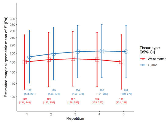 To consider the mechanical behavior of tissues under repetitive deformation, the influence of the repetition of the last indentation for each slice on the elastic modulus was analyzed as a fixed effect in a separate linear mixed-effects model (repetitive indentation model), using orthogonal polynomial trends (linear, quadratic) and also grouping by patient. The main effect of tissue type and its interaction with repetition were also investigated as fixed effects.