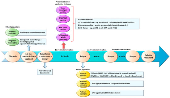Currently, most patients will recur within 3 years after first-line treatments and will require further rounds of chemotherapy and a maintenance therapy with bevacizumab and/or iPARP. Hence, OC is characterized by successive periods of oncological remission and recurrence with the time to progression drastically reduced with each recurrence [20]. We consider the period in the aftermath of the debulking surgery and the end of the primary chemotherapy as the best time frame to administer the cancer vaccines (Figure 1). This period may last from 6 to >24 months depending on the patient’s sensitivity to platinum chemotherapy and BRCA status [20]. During this period, the patients will have minimal residual diseases, making them ideal candidates for cancer vaccinations. The OC tumor microenvironment (TME) may also become less immunosuppressive due to the destruction of tumor cells and tumor vasculatures by chemotherapy. Studies have shown that certain chemotherapy can induce immunogenic tumor cell death, leading to the activation of tumor-specific T cells. Doxorubicin, an anthracycline chemotherapy used in OC, may induce immunogenic apoptotic tumor cell death and caspase activation in murine CT26 colon carcinoma and B16.F10 melanoma models [147]. DCs phagocytosed doxorubicin-treated tumor cells and successfully elicited CD8+ T cells to suppress tumor growth [147]. In OC, patients who underwent debulking and platinum-taxane chemotherapy developed memory T cells that recognized OC antigens and experienced prolonged survival [148]. Moreover, a study demonstrated a positive correlation between the potency of CD8+ T-cell responses following chemotherapy and favorable clinical outcome [149]. Platinum and taxane chemotherapy used in OC have shown to exert immunomodulatory effects [150,151]. These favorable features can help to strengthen the ability of cancer vaccines in activating potent antitumor T cell responses and developing immunological memory for durable tumor control.