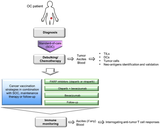 Proposed cancer vaccination strategies in the consolidation setting following standard-of-care chemotherapy and surgery in OC. The preclinical murine ID8 ovarian tumor model can serve as a useful tool to mimic the actual OC clinical scenario described here for evaluating combinatorial OC standard-of-care treatments and cancer vaccination strategies. As an example, during the first-line debulking surgery, different clinical samples (i.e., tumors, ascites and blood) can be obtained from the patients for preparing tumor WTL, DC vaccine, identifying and validating tumor (neo)-antigens from TILs and tumor cells. Next, different cancer vaccination strategies as described in Figure 1 can be implemented in combination with the OC standard-of-care, maintenance therapy or follow-up. Finally, additional blood and ascites samples can be obtained from the patients to evaluate their therapeutic anti-tumor T cell responses as well as track their disease regressions.