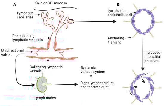 The lymphatic system is composed of a network of lymphatic vessels that connect lymph nodes and lymphoid organs. Lymphoid organs can be classified as primary or secondary. Primary lymphoid organs such as the thymus and bone marrow are involved in production of lymphocytes. The secondary lymphoid organs such as the spleen, lymph nodes, and tonsils control the maturation of lymphocytes and regulate immune response to pathogens and/or allergens [1,2]. In addition, the lymphatic system maintains fluid homeostasis in the interstitial compartment and participates in the absorptive function of the gastrointestinal tract [1,3]. The lymphatic system starts with blind-ended lymph capillaries (Figure 1A) in the skin and mucosa of the gastrointestinal tract. These capillaries are lined by a single layer of endothelial cells that are loosely connected to each other and deficient in both the basement membrane and pericytes. The loose connections between lymphatic endothelial cells increase the permeability of the lymphatic capillaries and facilitate exchange with the interstitial compartment [1,2,4]. Lymphatic endothelial cells are connected to the extracellular interstitial tissue with anchoring filaments [4,11]. When the interstitial tissue pressure increases, the anchoring filaments stretch and the junctions between lymphatic endothelial cells widen, resulting in increased passive transport (Figure 1B) of interstitial fluid, particles, lipids, and proteins [1,2,4].