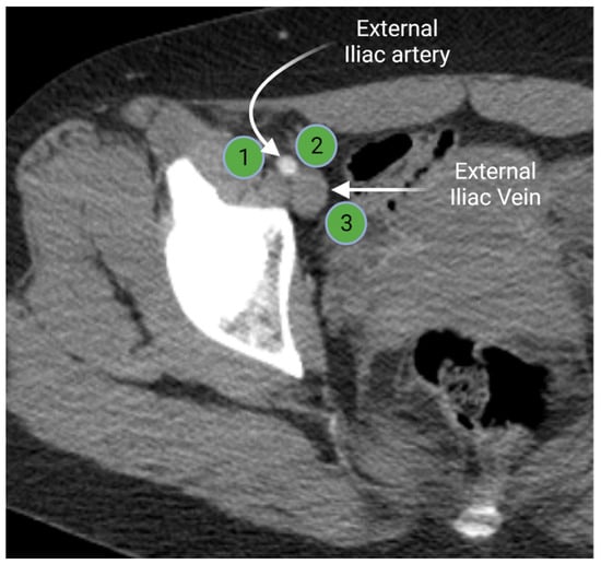 Axial contrast-enhanced computed tomography of the right hemipelvis demonstrates the right external iliac artery and veins with associated lateral (1), middle (2), and medial (3) external iliac lymph nodes. “Created by BioRander.com. accessed on 10 August 2021”.