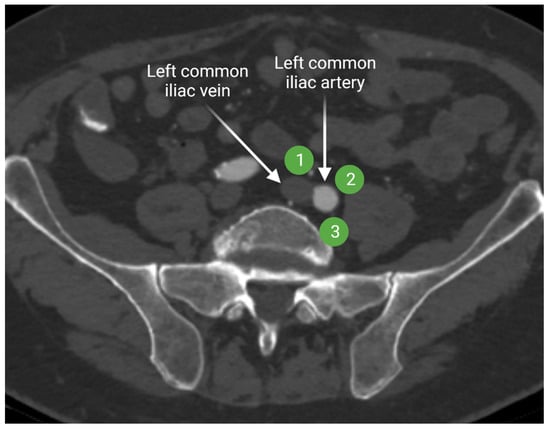 Axial contrast-enhanced CT of the upper pelvis at the level of the common iliac vessels shows the common iliac artery and vein. The lateral common iliac lymph node subgroup (1) is located lateral to the common iliac artery, while the medial subgroup (2) is medial to the common iliac artery. The middle subgroup (3) is in the lumbosacral fossa. “Created by BioRender.com. accessed on 10 August 2021”.