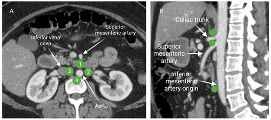 Axial contrast-enhanced CT of the abdomen (A) demonstrates the distribution of the peri-aortic lymph nodes: 1; pre-aortic, 2; left lateral aortic, 3; right lateral aortic, and 4; post-aortic. Sagittal contrast-enhanced CT of the abdomen (B) shows the distribution of the pre-aortic lymph nodes along the origins of the visceral branches of the aorta (celiac, superior mesenteric, and the inferior mesenteric arteries). “Created by BioRender.com. accessed on 10 August 2021”.