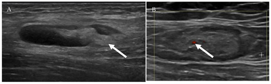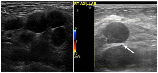 Ultrasound of the right axilla (A) demonstrates multiple, round, and hypoechoic metastatic lymph nodes with S/L axis ratio of approximately 1 and lack of the echogenic fatty hilum. Color Doppler ultrasound of the axillary lymph (B) nodes shows peripheral vascularity (arrow).