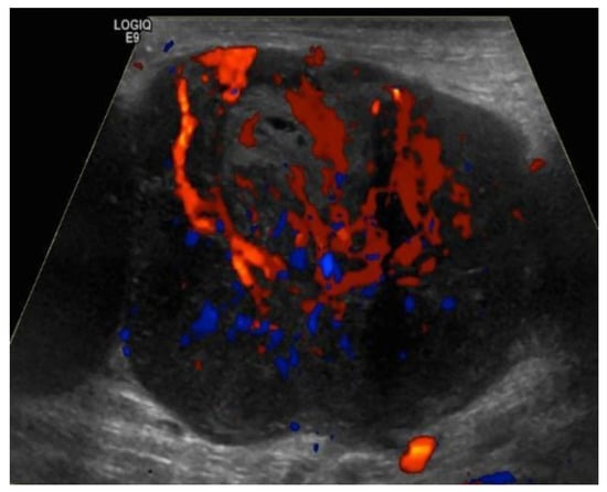 Vascular pattern seen on Doppler can be used in conjunction with grayscale features to assess benignity. Four vascular patterns of lymph node blood supply have been described: hilar, peripheral, mixed (peripheral and hilar), and avascular [24]. Normal lymph nodes are either avascular or have hilar blood flow (Figure 8). Malignant or reactive lymph nodes vascularity is usually peripheral or mixed (Figure 9 and Figure 10) [21,24,25]. Vascular resistance and resistive indices may offer clues in discerning malignant from reactive lymph nodes. Reactive lymph nodes typically demonstrate low vascular resistance secondary to vasodilation. On the other hand, malignant lymph nodes are more likely to demonstrative high resistive indices due to malignant infiltration of the lymph nodes that increases intranodal pressure and compresses blood vessels [24].