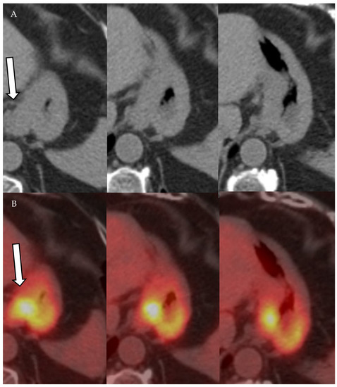 A 61-year-old female patient with history of gastric cancer. PET/CT scan demonstrates diffuse thickening of the gastro-esophageal region as well as the gastric cardia (arrow) (A) consistent with gastric carcinoma, which is FDG-avid (arrow) with maximum SUV = 11.6 (B). There is no focal abnormal metabolic activity to suggest distant metastatic spread or regional lymphadenopathy.