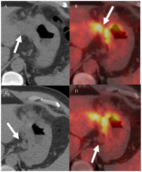 FDG uptake in neoplastic cells depends on the expression of glucose transporters. Most cancer cells are hypermetabolic and overexpress glucose transporters. Hence, most cancer cells will demonstrate increased uptake of 18F-FDG (Figure 11, Figure 12 and Figure 13). After cellular uptake, 18F-FDG undergoes phosphorylation by hexokinase and becomes trapped inside the cell. In addition to hypermetabolic cancer cells, inflammatory cells have increased 18F-FDG uptake, resulting in decreased 18F-FDG PET-CT specificity (Figure 14) [43]. Moreover, PET and PET-CT performance in detecting primary and metastatic lesions varies according the FDG avidity of tumor cells [43]. In cervical cancer, PET and PET-CT have higher sensitivity and specificity than CT and MRI in diagnosing malignant lymph nodes [44,45]. In breast cancer, PET-CT is more sensitive and specific when compared to US in detecting metastatic axillary lymph nodes. Additionally, PET-CT changes management in approximately 13% of breast cancer patients [46,47].