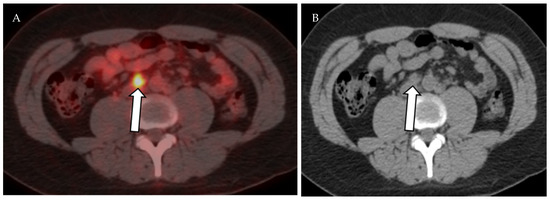 Axial fused PET-CT (A) and non-contrast CT of the abdomen shows mildly enlarged right paraaortic lymph node with increased FDG avidity on PET-CT (SUVmax 5.7), (B) biopsy proven Hodgkin lymphoma.