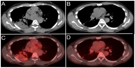 A 65-year-old male patient with right lower lobe lung cancer. The pulmonary mass seen in (A) shows avid FDG uptake (SUV = 4.6) in (C). Right hilar and subcarinal lymph nodes show mild FDG uptake (SUV = 2.6), which was found later to be inflammatory due to chemotherapy, resolving on (B,D). This is an example of false positive uptake in nonmalignant tissue.