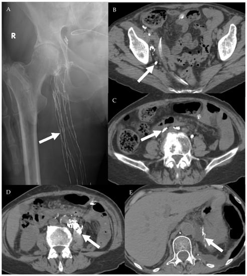 A 75-year-old female patient with abdominal leiomyosarcoma and chylous ascites. (A) Conventional lymphangiography was performed through the right pedal approach. The right inguinal lymphatic vessels are opacified (arrow) with subsequent opacification of the right pelvic lymphatic network (B,C). Noncontrast CT performed after lymphangiography shows ascending opacification of the lymphatic vessels and cisterna chyle (D). Estimated site of leakage appears from small lymphatic vessels in the left peri-aortic region at level of L3 (E).