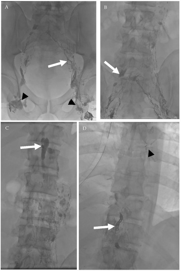 - Cope, C.; Kaiser, L.R. Management of unremitting chylothorax by percutaneous embolization and blockage of retroperitoneal lym-phatic vessels in 42 patients. J. Vasc. Interv. Radiol. 2002, 13, 1139–1148. [Google Scholar] [CrossRef]