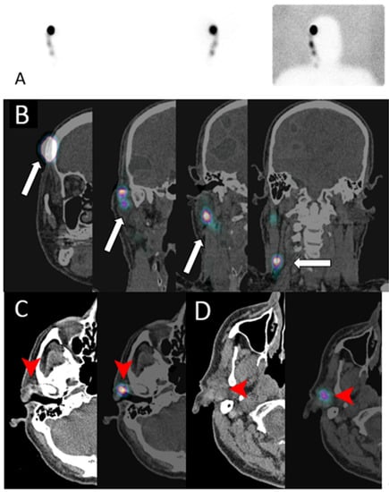 A 68-year-old male with melanoma in the right temporal region who underwent lymphoscintigraphy (A) and complementary SPECT/CT scan in the coronal plane (B); (C,D) show CT (left) and fused SPECT/CT images (right) for sentinel lymph nodes mapping. Intradermal injection of the TC99m sulfur colloid in the right temple (arrow in (B)) shows tracer uptake in the pre-auricular region (arrowhead in (C)) and intra-parotid region (arrowhead in (D)), consistent with sentinel lymph drainage.