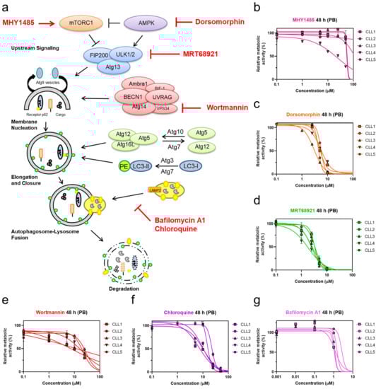 Targeting autophagy with distinct autophagy inhibitors induces concentration-dependent cytotoxicity in patient-derived CLL cells. (a) Overview of targets in the autophagic process and their pharmacological modulators; Determination of EC50 values of autophagy inhibitors (b) mTOR activator MHY1485, (c) AMPK inhibitor dorsomorphin, (d) ULK1/2 inhibitor MRT68921, (e) PI3K class III inhibitor wortmannin, (f) autophagosome-lysosome fusion inhibitor chloroquine, and (g) late-stage autophagy inhibitor bafilomycin A1 in CLL cells derived from five patients after 48 h of treatment using the PrestoBlue (PB) assay.