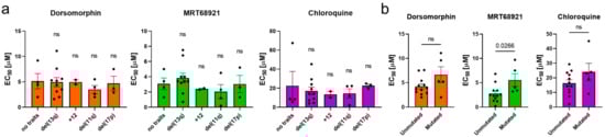 To investigate whether the presence of unfavorable genetic characteristics affects the activity of autophagy inhibitors, we grouped the EC50 values according to genetic characteristics (del(17p), del(13q), +12, del(11q), IGHV mutational status) (Figure 2). We showed that all three autophagy inhibitors acted against cells carrying del(11q) or del(17p), thus evidencing that inhibition of autophagy is as effective in CLL cells with unfavorable genetic characteristics as in cells with favorable genetic characteristics with the exception of MRT68921, which turned out to be more effective in cells with unmutated IGHV (p = 0.0266) (Figure 2b).