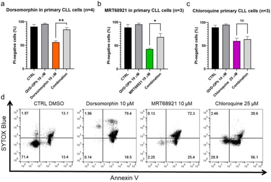 The activation of caspases is one of the hallmarks of apoptotic cell death, and thus, reduced cytotoxicity of these compounds can be expected upon inhibition of caspases with the pan-caspase inhibitor (QVD-OPh) to confirm apoptosis as the mode of cell death. These patient-derived CLL cells were treated with dorsomorphin, MRT68921, and chloroquine alone or in combination with QVD-OPh for 24 h. Afterward, the cell viability was determined using propidium iodide staining and flow cytometry.