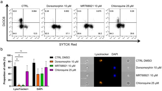 To further delineate the mode of cell death induced by inhibition of autophagy, we inspected the mitochondrial membrane potential and lysosomal integrity following treatment of the primary CLL cells with the autophagy inhibitors (Figure 4a). Here, the cells were incubated with 10 µM dorsomorphin, 10 µM MRT68921, or 25 µM chloroquine for 24 h, followed by mitochondria staining with 100 nM DiOC6, and cell viability determination with 2 nM SR. The proportion of live cells with high mitochondrial membrane potential (DiOC6+/SR−) was 33% in the control, which is relatively low, but is in agreement with the proapoptotic nature of CLL cells cultured under in-vitro conditions [25]. For the dorsomorphin and MRT68921 treatments, the proportion of DiOC6+/SR− cells dropped to 0%, and for chloroquine to 6%. This was paralleled by increased proportions of live cells with low mitochondrial membrane potential (DiOC6−/SR−) from the control of 55% to the dorsomorphin-, MRT68921-, and chloroquine-treated cells of 63%, 69%, and 64%, respectively. In line with the cytotoxic nature of these autophagy inhibitors, the proportion of dead cells (DiOC6−/SR+) also increased. Thus, treating these CLL cells with the autophagy inhibitors repeatedly and significantly disrupted their mitochondrial membrane potential (Figure 4a), indicating mitochondrial outer membrane potential (MOMP), another hallmark of apoptotic cell death. In short, these data show that MOMP, and therefore apoptosis, occurs in these CLL cells when autophagy is inhibited.