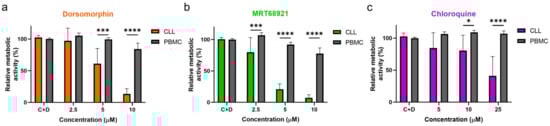 To investigate whether the actions of these autophagy inhibitors are directed selectively against malignant cells, the PBMCs of five healthy donors and 10 patients with CLL were treated with increasing concentrations of dorsomorphin, MRT68921, and chloroquine for 24 h. Head-to-head comparisons revealed that these autophagy inhibitors are more potent against CLL cells compared to PBMCs of healthy donors (Figure 5). Dorsomorphin and MRT68921 demonstrated the greatest cytotoxicities against CLL cells, while moderately impacting the metabolic activity of the PBMCs. The metabolic activities of CLL cells treated with 10 µM dorsomorphin, 10 µM MRT68921, or 25 µM chloroquine were 13%, 7%, and 41%, respectively, which were all significantly lower than those for the control PBMCs (84%, 78%, 107%, respectively). Thus, these autophagy inhibitors act selectively against CLL cells, which further substantiates the potential of targeting autophagy for the treatment of patients with CLL.