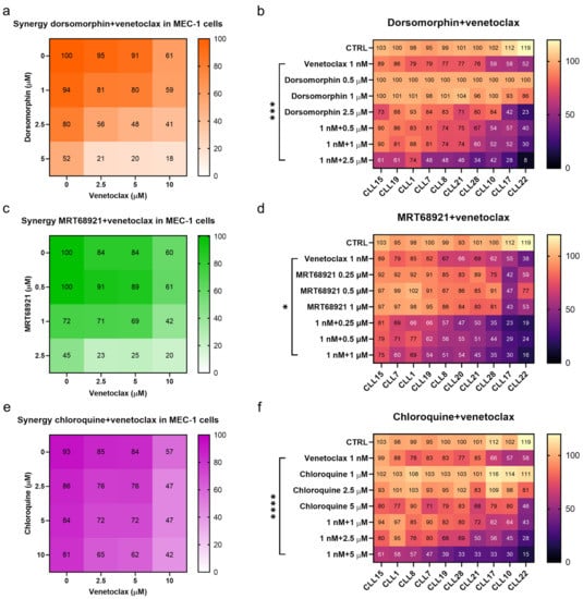 As MEC-1 cells cannot represent the diversity that comes with patients with CLL, we also determined the synergistic effects of venetoclax and the autophagy inhibitors on patient-derived CLL cells (from 10 patients). The cells were treated with 1 nM venetoclax, three different concentrations of dorsomorphin, MRT68921 or chloroquine, and also their combinations for 48 h. As for MEC-1 cells, inhibition of autophagy increased the cytotoxicity of venetoclax in these patient-derived CLL cells. However, while synergistic effects were shown for each set of patient-derived CLL cells, the degree of synergistic cytotoxicity varied substantially. The CLL cells that were more prone to venetoclax responded better to the autophagy inhibitors and the synergistic actions of the combination notably reduced the viable fraction of CLL cells (Figure 7). However, even in the patient-derived CLL cells that were only moderately affected by venetoclax or an autophagy inhibitor alone (viability > 80%), the combination treatments managed to kill 40–70% of cells (Figure 7b,d,f), thus suggesting that relatively noncytotoxic concentrations of drugs can have potent cytotoxic actions if they are used in combination.