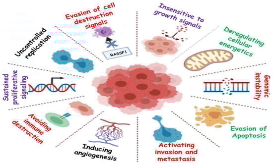 Cancer is a primary cause of death and a significant impediment to extending life expectancy, with 10 million fatalities in 2020, according to a WHO report. The number of newly diagnosed cancer cases is projected to increase to 29.5 million per year, and projected cancer-related deaths are expected to increase to 16.4 million per year by 2040 [1,2]. Despite novel medicinal techniques and technological advancements, cancer remains one of the most lethal diseases [3,4]. It is a disease characterized by uncontrolled growth of the cells [5]. Cancer cells normally exist in the body and function like regular cells. Cancer is triggered when uncontrolled cell division leads to excessive cell proliferation. Cancer cells have the ability to build up their own blood supply, break away from the original organ, migrate, and spread to other body organs [6]. Proliferation can be lethal if allowed to persist and spread, and it is mainly due to the ability of cancer cells to ignore signals, whereas normal cells only replicate when they encounter signals. It may also be due to the mutations in genes offering checkpoints for cell proliferation [7]. Genomic instability may also lead to cancer, in which increased alterations occur in the genome during the entire life cycle of dividing cells [8]. Another phenomenon through which cancer progresses is angiogenesis, leading to the development of new blood vessels for proper supply of nutrients and oxygen to metastatic cancer cells [9]. Cancer is not caused due to a single factor. In fact, numerous internal and external factors are involved in the initiation of cancer. Internal factors include mutations in genes, genetic disorders, and hormone imbalances, and external factors include exposure to radiation, malnutrition, infectious agents, tobacco use, etc. [10]. Around 90% of cancer-related deaths are caused by tumor spread, which is referred to as metastasis [11]. A hereditary gene defect is responsible for only 5–10% of all cancers. Despite the fact that all tumors are caused by a combination of mutations [12,13], these mutations occur as a result of interactions with the environment and carcinogens [14,15]. The main hallmarks of cancer are shown in Figure 1.