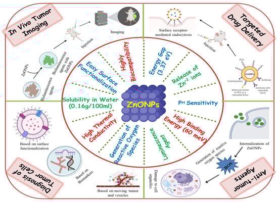 Graphical representation of the unique attributes of ZnO NPs and their various applications in fighting cancer.