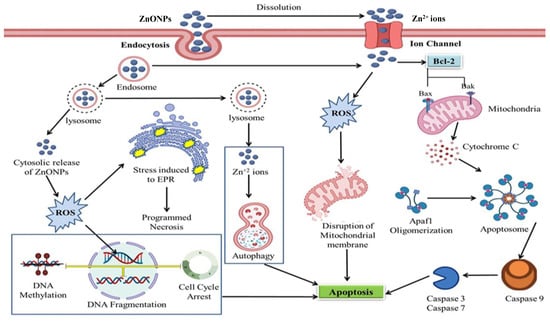 Apoptosis is a sort of controlled cell death that is one of the most popular ways for anticancer medications to generate cytotoxicity [148,176]. Several intracellular and extracellular factors have been found to activate an apoptotic cascade, including the generation of ROS, serum starvation, and ionizing radiation [177,178]. Mitochondria, the largest generator of ROS [177], are considered to be an active molecule in cell death pathways. DNA damage by ROS triggers p53. It is thus stated that ROS production by mitochondria is associated with apoptosis caused by p53 [179]. According to a study, PEG coated ZnO NPs are considered to be more stable than ZnO NPs alone. The anticancerous activity of both types of ZnO NPs was evaluated in this study and the results showed that the PEG coated ZnO NP-induced death in breast cancer cells by generating ROS and blocking the repair pathway at the same time, with low damage to normal cells as compared to naked ZnO NPs [180]. Similarly, a novel method of synthesizing ZnO NPs using egg albumin (EA) was employed and its anticancer performance on MCF-7 cells was evaluated. EA-ZnO NPs with a diameter of 20–60 nm induced ROS and upregulated p53, caspase 3, and caspase 9 while down-regulating Bcl-2 (an anti-apoptotic gene), resulting in cytotoxicity [181]. Thus, elevating apoptosis-inducing markers could be of potential importance in treating cancer.
