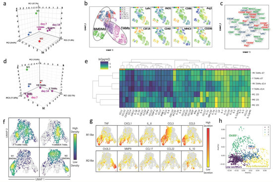 We also defined functional aspects of the melanoma TAMs in the TME through their secretion profiles. Again using PCA to visualize the population-level secretion program for each group, we observed that TAMs occupied a distinct functional state from M0, M1, and M2 BMDMs, and these differences increased over time (Figure 1d). Analysis of the cytokine and chemokine (C/C) secretion levels showed that TAMs secrete a broader number of C/Cs than BMDMs with well-defined polarization states (Figure 1e), and displayed more variance between samples (Figure S1c). TAMs isolated from day 14 tumors were more active secretors than those from day 7 tumors.