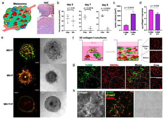 Mimicking the early melanoma TME with a 3D co-culture system. (a) Characterization of YUMM tumors. Schematic representation of the melanoma microenvironment (left) and H&E staining of tumors showing the intradermal tumor structure, infiltrating the whole dermal compartment and the subcutaneous space (right). (b) Quantification of EGFR+ fibroblast density in two regions of the tumor, the middle (Mid) and the Edge. In this melanoma model, fibroblasts are evenly distributed across regions of early tumors but, after day 7, they are rapidly segregated to the edge. (c) Change in tumor volume between d7 and d14 in YUMM (n = 6). (d) Quantification of soluble collagen in YUMM tumors (d7 n = 2, d14 n = 4). (e) Representative images of the morphology of spheroids of different compositions, embedded in collagen matrix. Y = green, M0 = red, F = yellow. (f) Schematic of the proposed translation of the melanoma TME into a 3D collagen cultures for in vitro analysis, combining BMDMs with YUMM cells and fibroblasts. After a few days in these cultures, BMDMs show different activation states, depending on their and the presence of other cells. (g) Representative image of a YUMM+BMDM 3D culture seeded as a single cell suspension of the cells. The white ellipse delineates an area where macrophages are located further away from YUMM cells. Inserts on the right are cropped areas delineated by the dotted squares. Zoomed-in images of how macrophages differ in morphology as soon as 24 h after starting the co-culture, Scale bar in 200 µm. (h) Representative images of collagen remodeling at 48 h post gel embedding, containing unstimulated BMDMs (M0), 3T3MEF fibroblasts and YUMM cells. Initial cell seeding number M0: 24 × 103/well, YUMM: 2 × 103/well. Fibroblast: 6 × 103/well, in 10 µL gel. Scale bars are 100 µm.
