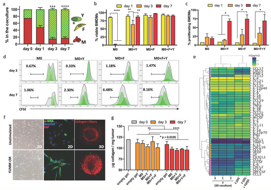 Once we determined the optimal density and conditions for each cell type in the 3D collagen-I environment, we characterized the composition of the co-culture at different timepoints. Starting with a composition containing 75% BMDMs (12M:3F:1Y ratio), we observed a rapid increase in the tumor cells and fibroblasts in the first 24 h, most likely due to their higher proliferation rates. By day 3, the macrophages made up less than 20% of the total culture, while the tumor cells and fibroblasts significantly increased in number, comprising more than 80% of the culture system (Figure 3a). This ratio was sustained over time, showing similar proportions after a week (Figure 3a). We next characterized the health and proliferation of macrophages as a function of other cells in the co-cultures. BMDMs cultured alone in the collagen-I matrix, in complete media but without M-CSF or polarizing cues, remained viable for the first 24 h, but did not survive past day 3 (Figure 3b). However, the presence of either fibroblasts or tumor cells within the culture significantly increased their survival, with fibroblasts slightly more efficient than tumor cells at maintaining the viability of the BMDMs (Figure 3b, day 3 timepoint). Consistent with viability, the proliferation of macrophages in the 3D co-cultures gradually increased over time, and by day 7, most of the BMDMs had undergone at least one division cycle (Figure 3c). The presence of fibroblasts induced increased macrophage proliferation as early as day 3, and also supported a larger fraction of highly proliferative macrophages (Figure 3d). Increased BMDM viability and proliferation in 3D co-cultures with tumor cells and fibroblasts was observed with all polarization states (Figure S3a,b).