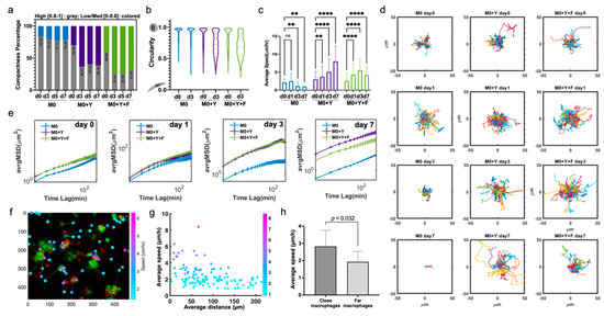 The average speed of macrophage migration in 3D co-cultures with fibroblasts and tumor cells increased over time; in contrast, the average speed of macrophages in mono-cultures remained low (Figure 4c,d). This demonstrates that the presence of melanoma cells and/or fibroblasts, provided cues that not only maintained macrophage survival but also promoted activation and migration. Macrophages in M0+Y and M0+Y+F generally exhibited similar levels of motility, as shown by their average displacement within the 3D gels (Figure 4e). Of note, BMDMs in the M0+Y condition migrated around the culture slightly more than the M0+Y+F condition on day 7, as seen both by average speed and displacement (Figure 4c,e).